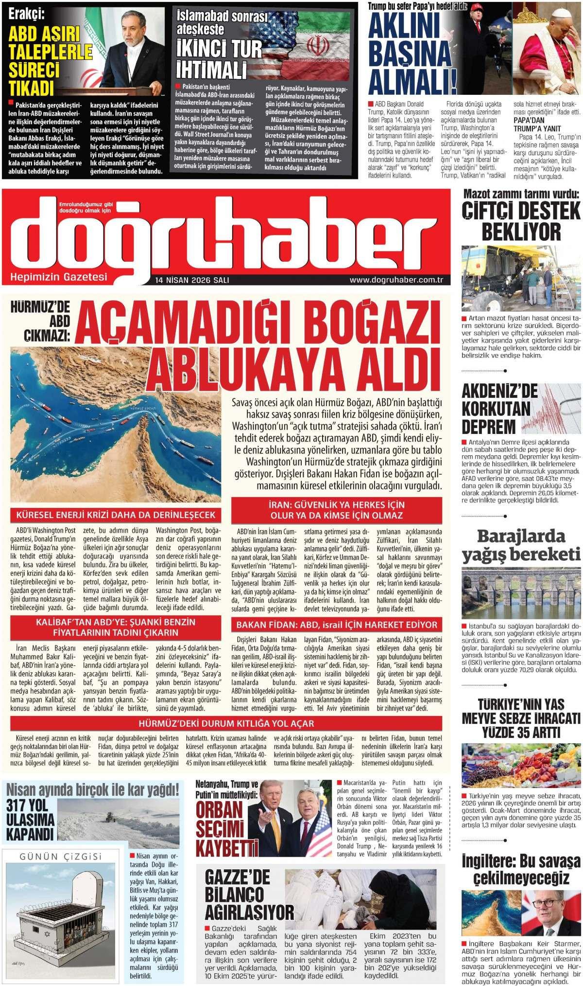 Doğru Haber Gazetesi 14 Nisan 2026 Günü Manşeti