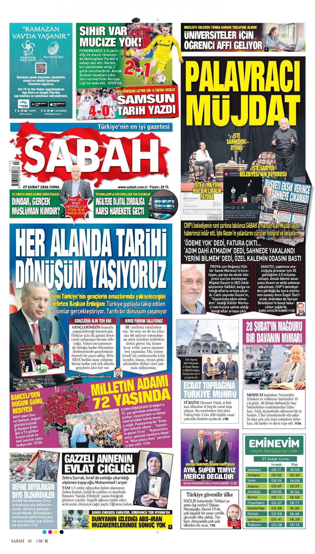 Sabah Gazetesi 27 Şubat 2026 Günü Manşeti