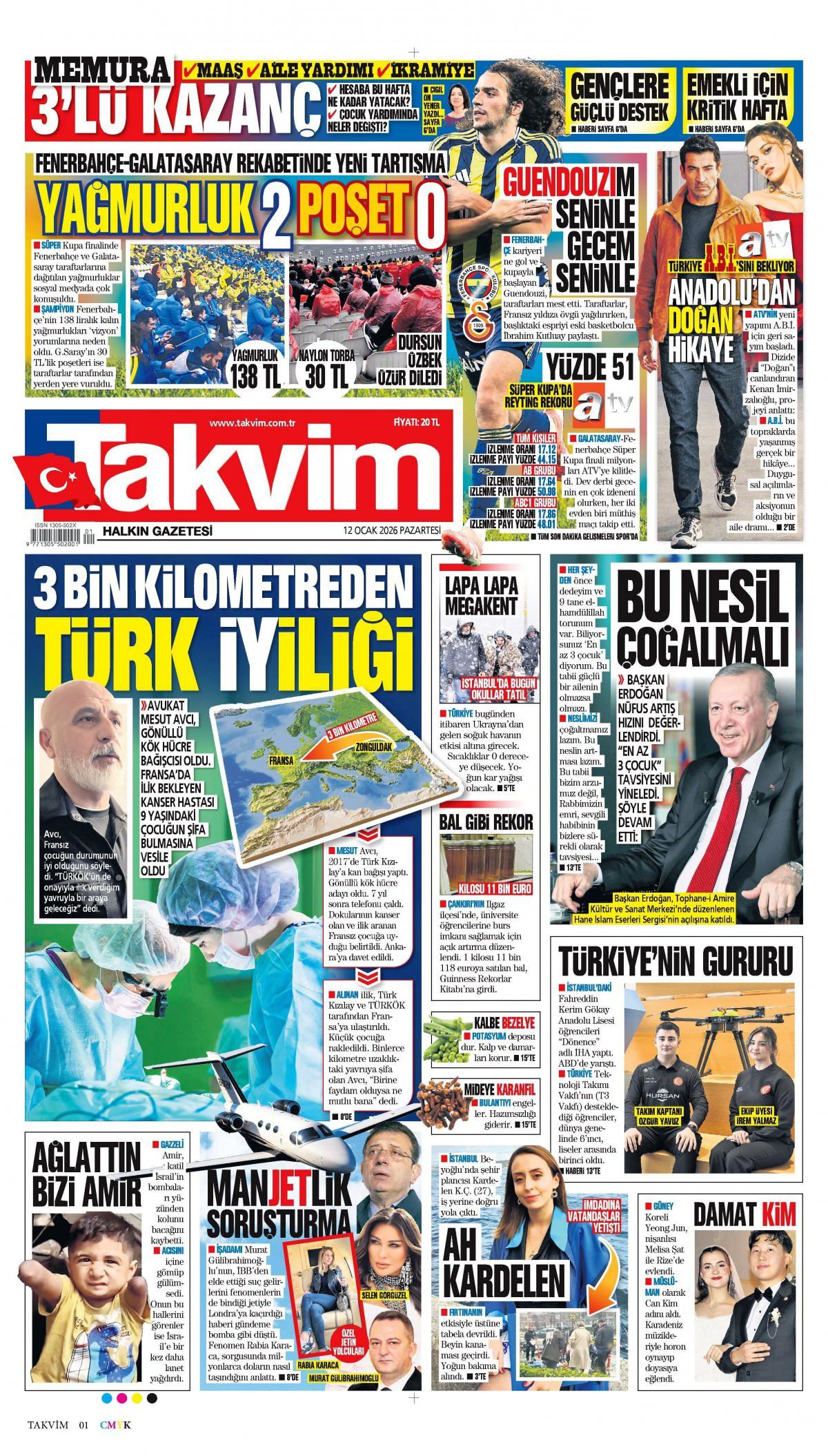 Takvim Gazetesi 12 Ocak 2026 Günü Manşeti
