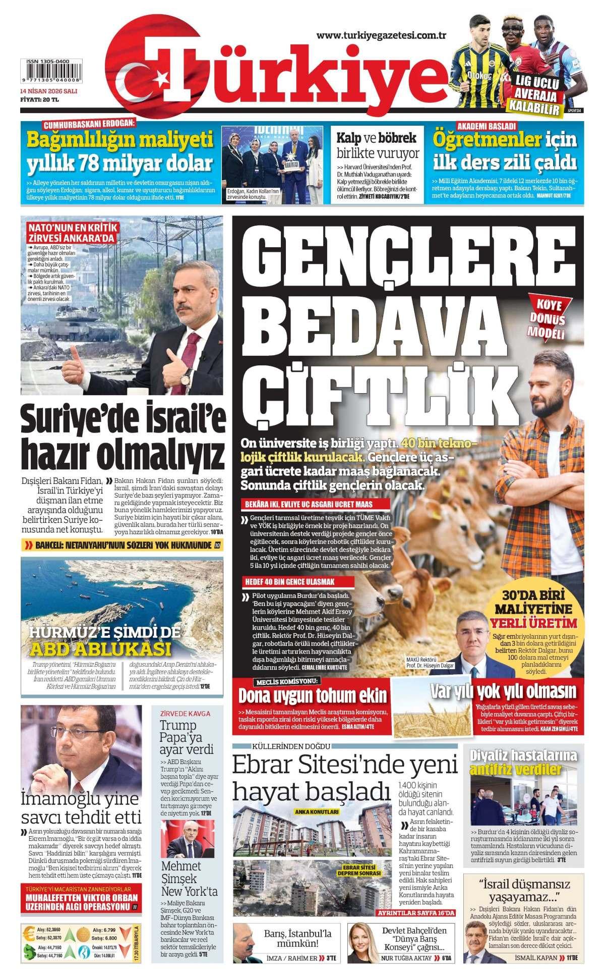 Türkiye Gazetesi 14 Nisan 2026 Günü Manşeti