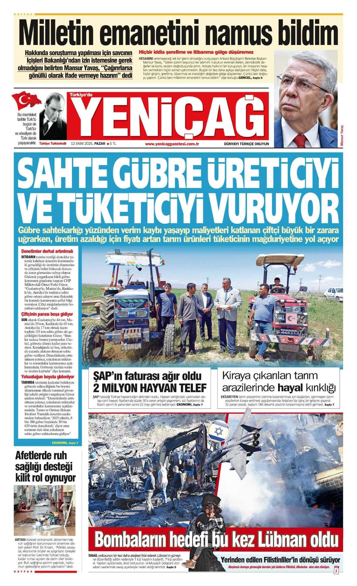 Yeni Çağ Gazetesi 12 Ekim 2025 Günü Manşeti