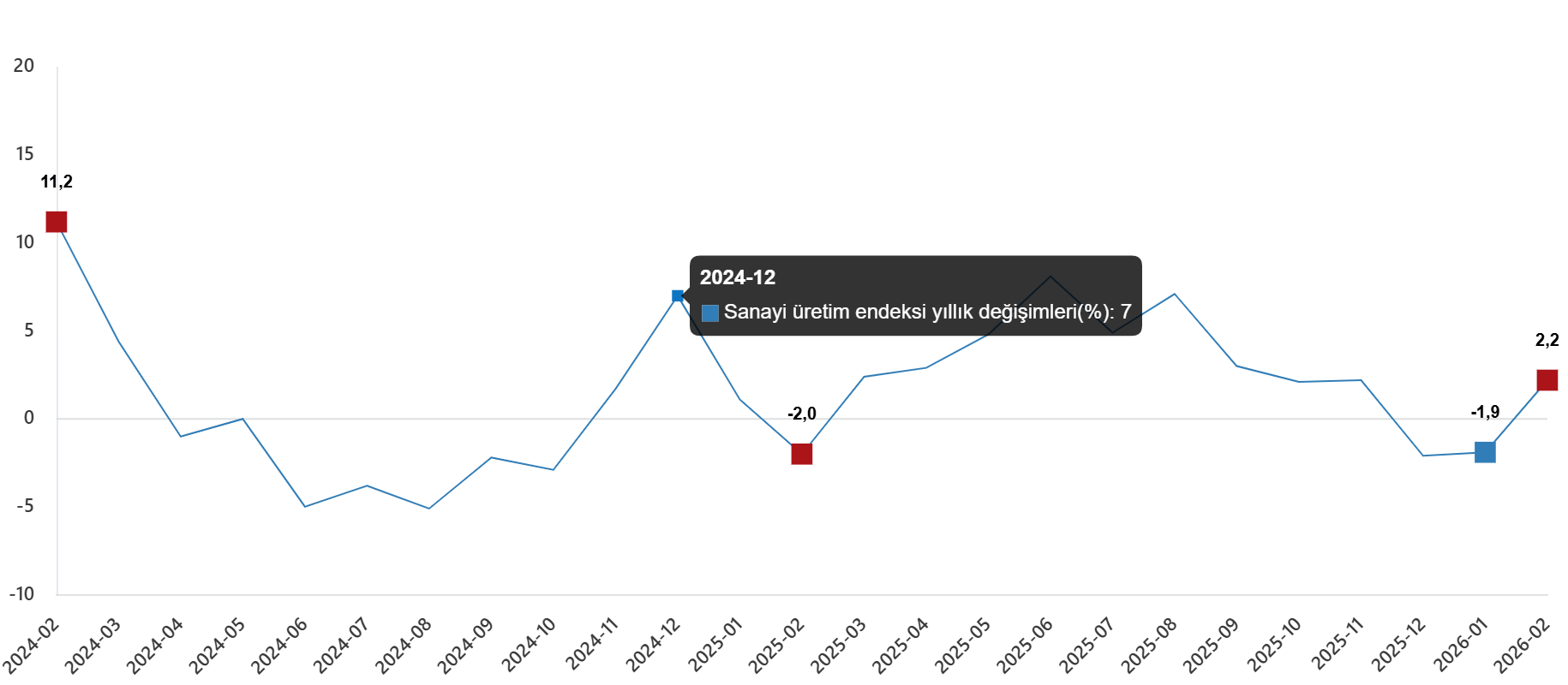 Sanayi üretim endeksi yıllık değişimleri(%), Şubat 2026